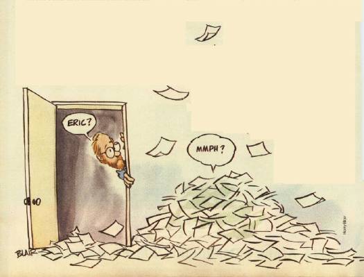 Paper scraps flooded the bedroom, and his dad grew alarmed. He had visions of being drowned by Pooh pictures. He suggested that Eric try to group the papers into piles.