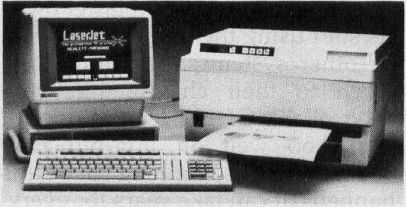This Hewlett-Packard LaserJet printer is shown hooked up to an HP 150 computer, but it also works with the IBM PC and compatibles.