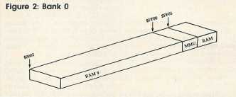 Figure 1 shows the configuration for bank 15. From locations $0002-$3FFF there is RAM. The 128 in the computer's name means that the computer has a total of 128K of RAM, which is arranged in two 64K blocks called RAM 0 and RAM 1. Don't confuse these blocks with banks—some RAM from one or both of these blocks appears in every bank, but the amount varies.