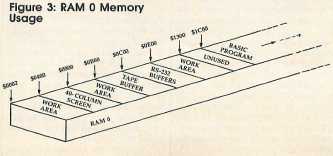 Figure 3 also reveals other unused or little-used memory zones. If you don't need to use a tape drive, the cassette buffer from 2816-3071 ($0B00-$0BFF) is free. If you aren't using telecommunications, the RS-232 buffers from 3072-3583 ($0C00-$0DFF) are also available. And there's a large block of empty memory marked reserved for applications software that stretches from 4864-7167 ($1300-$1BFF), providing over 2K of contiguous free space.