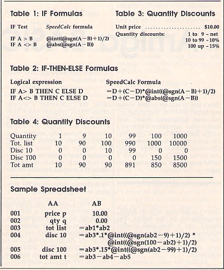 Many people use a spreadsheet as little more than a glorified calculator: Once a sheet has been set up, you punch a button and the program performs a large number of related calculations. While the result of one calculation frequently serves as input for another, the process doesn't involve anything resembling intelligence on the part of the program. Nevertheless, the SpeedCalc spreadsheet program can test conditions and take action based on the results. The process works very much like the familiar IF-THEN-ELSE construction in BASIC.