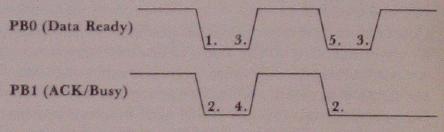 - XMTR puts a data BYTE on the lines, sets the 'Data Ready' line high and waits for the RCVR 'ACK/Busy' line to go high signifying that the data has been received.