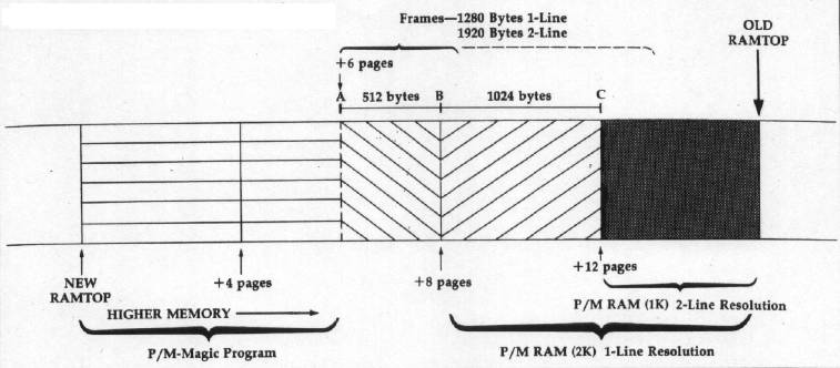 P/M Magic resides at the high end of RAM and requires 4K (4096 bytes) of memory. To protect this memory area, you should perform POKE 106,PEEK(106)–16 before POKEing the machine language into memory. That statement moves the computer's RAMTOP pointer 4K lower in memory, making the computer think it has 4K of memory less than it actually has.