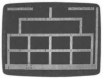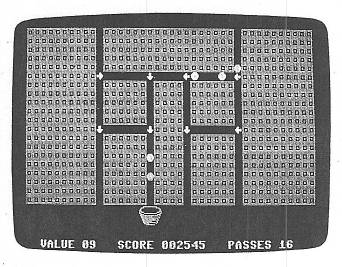 When marbles drop into the maze, they appear as asterisks (<+>*+>). When an asterisk travels over a dot, it turns into an at sign (@) and the dot disappears. You get points only for the latter type of marbles—one point for each dot the marble travels over. Each intersection has an arrow that determines the direction in which the marbles travel. Press the paddle button to change the direction of all the arrows on the screen. The arrows move clockwise. (Note: On Apple II and II+ models, alphabetic characters will appear in place of the arrows and buckets. This does not affect the operation of the game.)