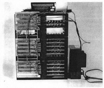 Finally, a third card file was added and bus jumpers installed to give a total of 14 slots. Three additional 16K memory boards were scrounged (I had no idea that more than 9 or 10 boards could be driven) to give a total of 192K of RAM. Again there were no obvious problems and the bus was being loaded to three times rated capacity! Figure 3 shows what the stack of card files looked like which is obviously impractical unless one cuts a hole in the tabletop to let the two extra card files hang below (I simply sat on a drafting stool to use the system). The rear view in figure 4 shows the interconnected motherboards and individual Board Enables from the application connector. Note the gridwork of copper braid between motherboards which makes the groundplane essentially continuous between the motherboards.