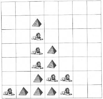 The intellectual action in this game of thought takes place on a 7×7 board (see figure on following page). Your goal is to line up four Sphinxes in a row, in any direction, before the computer lines up four of its pyramids. To make a move, use the arrow keys to slide a Sphinx along the top edge of the board, then press ENTER or RETURN. The Sphinx will fall to the bottom of the column. The computer moves similarly.
