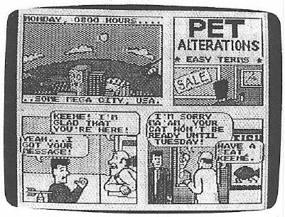As the story opens, private spy and thrill seeker Steve Keene has been summoned to headquarters (which is cunningly disguised as a small-time pet alterations business) where the thinskinned chief tells him of an assignment he must complete. As the conversation progresses, you have the opportunity to choose Steve Keene's banter. Will he use wisecracks or respond in a low-key, respectful manner? The decision is yours. But be careful. The chief is not only thin-skinned but also mildly paranoid (as it pays to be in the private spy business). Even if you stick to straight responses, he may get the feeling you are ribbing him, and you'd better apologize when he gets steamed. A word to the wise.