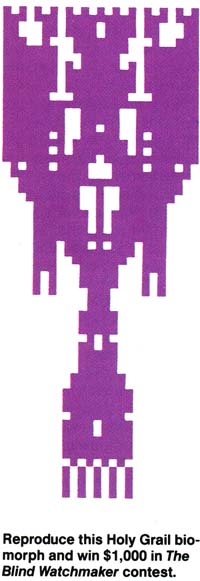 There's even a $1,000 prize for anyone who can find the genetic key to create a particular Holy Grail-like biomorph whose formula was lost after it evolved. The book, which has been hailed as one of the most important science books of this century, is fascinating, exceptionally well written, and highly recommended. The Macintosh disk was created by Dawkins himself after he received many requests for such a program from readers of the hardback edition. The program requires a minimum of 512K to run and costs $9.95 plus $1.00 postage and handling. Details on ordering the disk are in the paperback edition of the book, available at most bookstores.