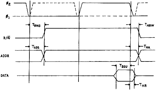 The R/W and address lines have a setup time (TRWS and TADS) as 300 ns maximum after the beginning of ø1. Data is available in a maximum of 200 ns after the rise of ø2 (TMDS). ø2 has a minimum width of 430 ns with a one micro second clock (1MHz). Thus data is available a minimum of 230 ns before the fall (locking edge) of the ø2 clock. The data is held beyond the fall of ø2 for a minimum of 30 ns (THW). Thus the 6502 is guaranteed to write successfully to any device with a setup time requirement of 230 ns or less, and a hold time requirement of 30ns or less. Implicit in the timing is that the falling edge of ø2 is the locking edge. The 6502 generates no write strobe. A write strobe must be fabricated by NANDing ø2 with the inverted R/W signal, R/W. This gives a strobe that goes low during ø2 only for a write cycle. In family devices, ø2 and R/W are applied separately and the gating is performed internally.