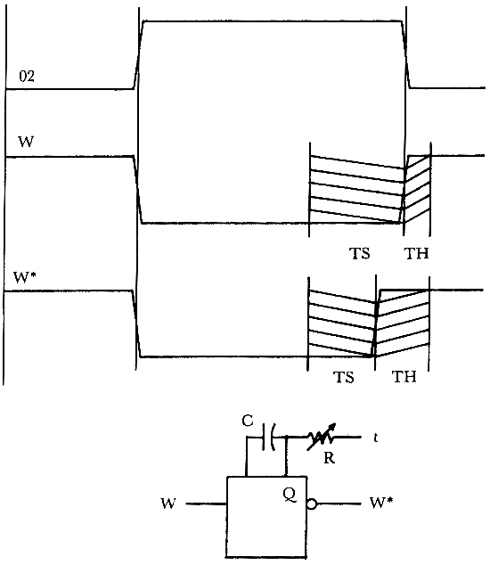 In any latching operation, the following sequence occurs: Data is presented to an input, a locking edge occurs, and finally the data is removed. In general, the data to be written exists before and after the locking edge. We are now ready to define the important parameters of a write operation. The “setup” time is the minimum time the data must be present before the locking clock edge occurs. The “hold” time is how long the data must remain after the locking edge has gone away. The setup and hold times for a 7474 flip-flop are only 20 and 5 ns respectively. Since these times are so short, TTL latches can always be assured of working with MOS processors.
