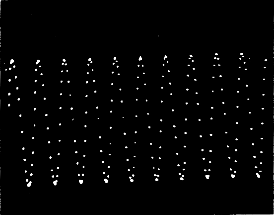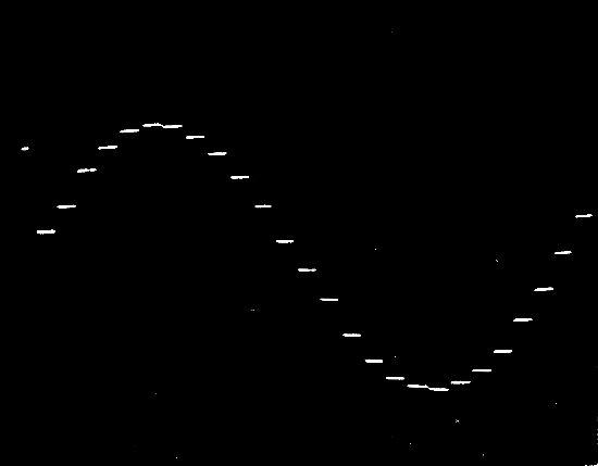 In Figure 4 we show a photograph of the results of sampling a 1000 Hz sine wave at a rate of about 25,000 Hz. The photograph shows 256 points on the sine wave. Since we did not have a camera for our oscilloscope, the pictures were taken through a Celestron 5” telescope, placed about 25 ft. from the oscilloscope. Figure 5 shows the scope trace expanded to show just one cycle of the same waveform in Figure 4. Figure 6 shows 256 points of a 100 Hz sine wave sampled about once every 40 microseconds, while Figure 7 shows 256 points on a 10 Hz sine wave sampled once every 2000 microseconds. Figure 8 is the waveform of the A string of an electric guitar just after being plucked. The sampling rate in this case was about one sample every 85 microseconds. Finally, in Figure 9 we show a sampled version of a 2500 Hz sine wave. Clearly the system still does a pretty good job of reconstructing a 2500 Hz sine wave, but the information in frequencies much above 5000 Hz will be lost. Hopefully these pictures are worth a thousand words.