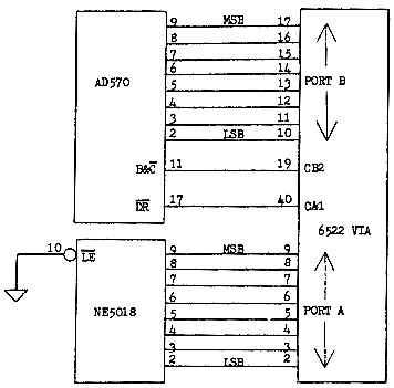 Figure 10. Interfacing the AD570 and the NE5018 to a 6522 Versatile Interface Adapter. Only data and control connection are shown in this figure. Refer to Figure 1 for the other details.