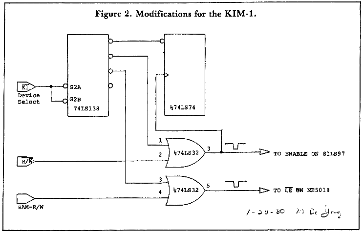 For all you purists who think that if it can't be done with a KIM-1 then it isn't worth doing, the circuit in Figure 1 will also work with a KIM-1. We simply replaced the DS9 device select with the Kl device select produced by the onboard 74145. A 3.3k pullup resistor is required. The entire circuit can be simplified somewhat with the modifications shown in Figure 2. The various 04s, 02s, and 00s are replaced with two gates on a 74LS32, the Kl device select goes to the 74LS138, and the remainder of the circuit is the same as in Figure 1. The RAM-RW signal on the KIM-1, which does not have the same meaning on the AIM 65, can be used to simplify the logic, as shown in Figure 2. The same simplification could probably be used with the SYM-1.