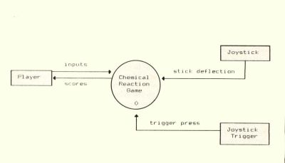 The context diagram often is labeled with a zero, as in Figure 1. This indicates that, on another piece of paper, we are going to peer inside this one bubble and see what it contains in more detail. The magnified view of object "Chemical Reaction Game" will be labeled the zero-level diagram, and it will be another DFD containing the four kinds of objects mentioned in the previous paragraph.