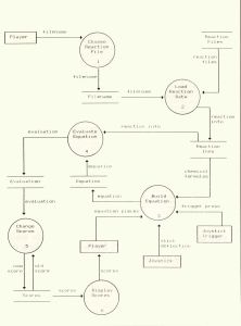 The data stores in Figure 2 have labels like Filename, Reaction Files, Reaction Info, Equation, Evaluation and Scores. Notice that many of the data flows have exactly these same names. This should come as no surprise. After all, it is data that is flowing from one process to another, and data stores are simply collections of data. However, sometimes a process needs only part of the data in a particular store.