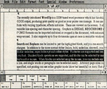The recently introduced WordUp is a GEM-based word processor which has the ability to use GDOS output, producing print quality as good as your printer can manage. It can use multiple fonts with varying typefaces, effects and sizes. These are viewed on the screen. It also allows variable line spacing and character spacing. Graphics in DEGAS, Neochrome and GEM (.IMG) formats can be imported and sized or cropped in the document, with automatic text wrap-around. It also supports up to four documents open at once in resizable windows.