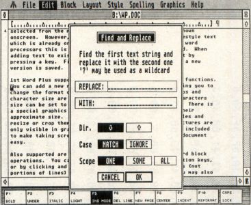 WordPerfect is a GEM-based word processor which has multiple resizable windows and can have four documents open at once. The huge number of commands are entered using combinations of menus, function keys (40 function-key commands) and keystrokes. The program is complex enough that a keyboard template is included. All the normal word-processing functions are supported, such as headers and footers, block operations, search and replace The block selection can be by mouse, menu or function key. A spell checker is provided, along with a huge thesaurus. Words can be added to the main spelling dictionary. There is currently no support for importing graphics.