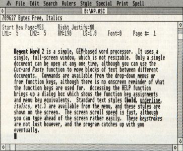 Regent Word 2 is a simple, GEM-based word processor. It uses a single full-screen window, which is not resizable. Only a single document can be open at any one time, although you can use the Cut-and-Paste function to move blocks of text between different documents. Commands are available from the drop-down menus or from function keys, although there is no on-screen reminder of what the function keys are used for. Accessing the Help function brings up a dialog box which shows the function-key assignments and menu-key equivalents. Standard text styles (bold, underline, italics, etc.) are available from the menu, and these styles are shown on the screen. The screen-scroll speed is fast, although you can type ahead of the screen rather easily. These keystrokes are not lost, however, and the program catches up with you eventually.