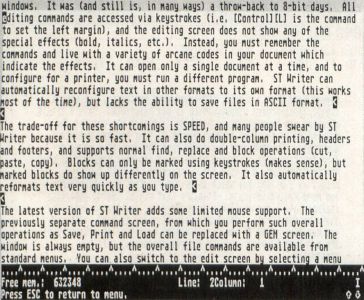 The trade-off for these shortcomings is speed, and many people swear by ST Writer because it is so fast. It can also do double column printing, headers and footers and supports normal find, replace and block operations (cut, paste, copy). Blocks can only be marked using keystrokes (makes sense), but marked blocks do show up differently on the screen. It also automatically reformats text very quickly as you type.
