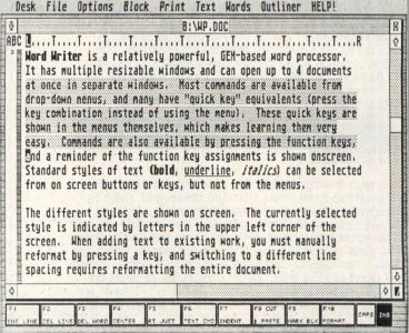 Word Writer is a relatively powerful, GEM-based word processor. It has multiple resizable windows and can open up to four documents at once in separate windows. Most commands are available from drop-down menus, and many have "quick key" equivalents (press the key combination instead of using the menu). These quick keys are shown in the menus themselves, which makes learning them very easy. Commands are also available by pressing the function keys, and a reminder of the function-key assignments is shown on-screen.