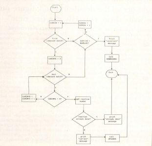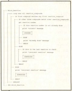 Flowcharts. You're probably familiar with the flowchart. This graphical method has been used for many years to represent the details of logic and execution sequence in a program. A sample flowchart is shown in Figure 1. This example, like the others in this article, is drawn from my chemistry game "Reaction Time," written for the 8-bit Atari computers in assembly language.