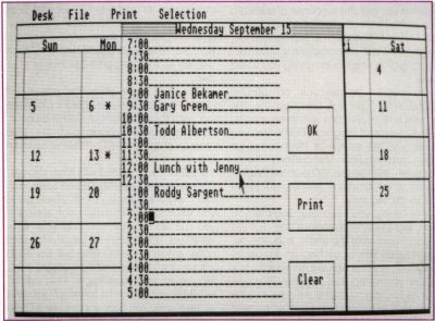 Editing is done in "replace" mode; so just type over any mistakes you make. The delete and insert keys also work. Pressing the "Clr" key will clear the line on which the cursor rests. There are also three "buttons" in the window. The OK button returns you to the calendar. (You may also press the escape key to exit to the calendar.) Click on the same day again, and you will find that your entries are still there. However, you must save the file before selecting another month and year (and generating another calendar), or you will lose your entries. The Print button will print the current day's appointments on the printer.