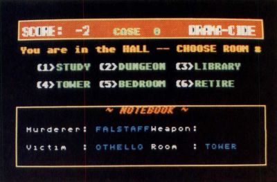 Your display at this time will show the following information. At the top of the screen there is a title bar which displays your current score for the case you are working on, the number of the case (there are ten cases numbered zero to nine) and the title of the game. The middle of the screen will inform you of your present location and give a list of the five rooms in the castle (Study, Dungeon, Library, Tower and Bedroom), each numbered for easy access.
