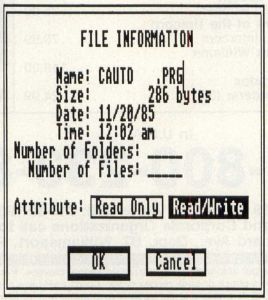 Show Info under the file menu looks a little different in Figures 1, 2 and 3; mostly it's just easier on the eyes. The main difference is that now, for the first time in TOS history, you can change the name of a folder (hooray!). Before there was no way to do this from GEM itself. Thus, if you want to rename a folder, you can change its name just like you can on a file. Furthermore, as with much of the new TOS, things are much clearer. For example, notice that the box in Figure 3 is labeled "FILE INFORMATION." The old TOS box for this was labeled "ITEM INFORMATION," which isn't as accurate. There is also more consistency between similar boxes. Show Info on disks, folders and files all return dialog boxes which are laid out more or less the same, with the same terms, etc. However, note that while the same dialog appears for files and folders, the "Attributes" are only active for files. Thus, you can't "lock" a folder.