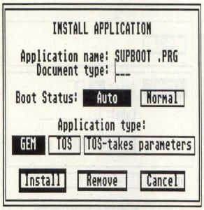 The Boot Status options are the most interesting. "Normal" means the installed program runs just like always. However, selecting "Auto" (and then saving the Desktop) will result in the selected program (just one, mind you) auto-running whenever you boot-up. This program can be on any drive and, better yet, doesn't have to be in the AUTO folder on your boot drive (in fact, if it is, it'll run twice). Even better, since the auto-boot program is run after TOS runs the GEM Desktop, you can now auto-boot GEM programs (impossible to do from the AUTO folder because GEM isn't activated until afterward). You can run TOS and GEM programs but not those of the TTP variety.