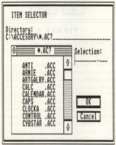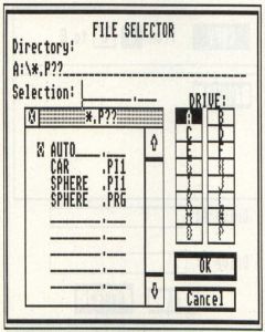 The new selector has buttons for each of the 16 possible drives the ST can access (A-P), and switching from one drive to another is as simple as clicking on the appropriate button. To reread a disk no longer requires clicking on the "grip" bar at the top of the directory box; just clicking on the appropriate drive button. Furthermore, a new AES call (FSELEXINPUT) has been added which allows programmers to replace the File Selector label at the top of the selector with the message of his/her choice. Before, tricky programming was needed to do this.