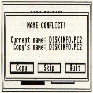 If a name conflict occurs during a copy procedure, a NAME CONFLICT! box appears as in Figure 10. Unlike the old box, whose only options were OK (overwrite) and Cancel (skip), this new box contains three buttons: Copy (overwrite), Skip (go to next file, if any) and Quit (abort copy procedure). The addition of Quit is welcome as it allows you to abort, which was previously impossible. If the File Overwrites option of Set Preferences is set to No, NAME CONFLICT! will not appear when duplicate filenames are encountered—they will just be overwritten. NAME CONFLICT! will appear for conflicting folder names regardless of the status of the File Overwrite setting.