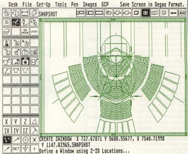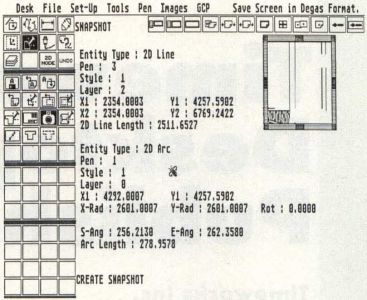 The screen can be saved as a DEGAS format picture file, although the menu pad, menu bar, etc., are also included. There is no way to save just the drawing screen.