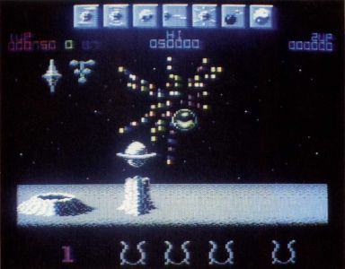When you fill a cauldron with color you are transported to a Bonus Stage. There you kill aliens for bonus points. Kill a Wiz look-alike, and you get another life. Then you go to the Wizlab where a beautifully animated sequence shows Wiz restoring some of the color to Wizworld. In the lab you can choose one control or weapon that all your Wizballs will be able to use for the rest of the game.