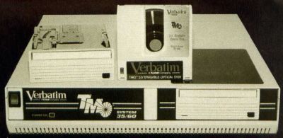 Verbatim demonstrated the TMO 3.5-inch Erasable Optical Disk, a medium that can hold 60,000,000 bytes of information on one 3.5-inch diskette. The disk is inserted into a special disk drive that uses a combination of lasers and magnets to create erasable optical disk storage technology. The disk spins at 2400 RPM and provides performance similar to current hard-disk systems. Verbatim's drive will feature a high-speed SCSI-compatible interface, making it compatible with several existing ST computer interface cards. Verbatim expects a summer 1989 release date of the finished system, pricing was not known.