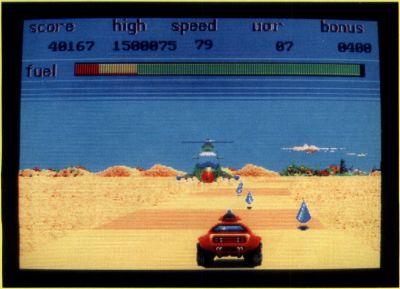 Another problem with the game play is the way the random elements are handled. You know there's a design flaw somewhere when your scores vary from 30,000 to 1,500,000, from one game to the next. The problem seems to be the placement of the fuel cisterns: Sometimes they are placed everywhere, while other times you can't find one no matter how fast you make your vehicle go.