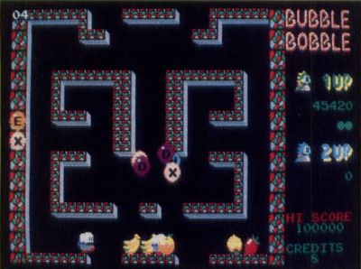 In Bubble Bobble, one or two players control (via joystick) Bub and Bob (two of the cutest brontosaurs you'll ever run into) throughout the 100 screens that make up their world. The two dinosaur friends have many enemies (I don't know why; they're too darned cute to dislike), so they've developed a most unusual defense mechanism: they blow bubbles. These bubbles will trap within them any creature they contact, after which the bubbles will rise slowly to the top of the screen.