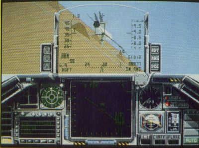 The display is standard stuff. Your main view is out of the front of your canopy and contains most of your gauges in addition to the heads-up display, which superimposes the most important readouts onto the canopy itself. Left and right cockpit views access additional gauges and warning lights. In contrast to the superb graphics that form the cockpit, the landscape is a disappointing but adequate vector-graphic view. Additional features include a black box that records your flight for later analysis and has the ability to play head-to-head (using another computer) via modem.