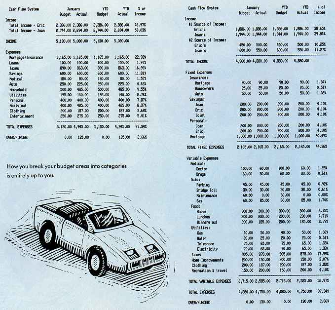 Entering these figures on a spreadsheet, you have the easy option of jockeying figures around. Once you've set down your amounts in each category, for instance, you can easily see what happens to the other totals it you buy a car with a larger car payment. Or if you decide to cut back on restaurants and alter your food budget accordingly.