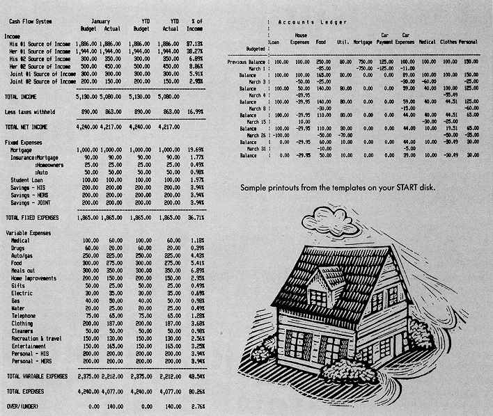 We have provided templates that will get you started on your budget. but to develop a system that will suit your individual needs you will want to customize the template. Break down your budget categories in ways that make the most sense to you. If you are using the accounts ledger system, adjust it so that spending and deposit amounts are entered daily, weekly, or whatever is most convenient. (In the example on disk, we have entered dates three or four days apart; you may want to prepare rows for each day of the month, or fill in the dates as you go along.) After you have customized the template, be sure to save a copy without any amounts filled, to use as a blank for the next budget period.