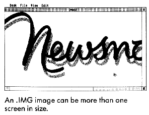 Another solution is to use drawing and DTP programs that use .IMG-format pictures. .IMG pictures aren't limited to screen size - they can be as small or as large as you like (Most ST scanners can save their images as .IMG files.) An .IMG file can easily hold a picture that's 8-by-10 inches at 300 dpi resolution. However, you'll need a hard disk to hold that file- it will be about 900K in size!