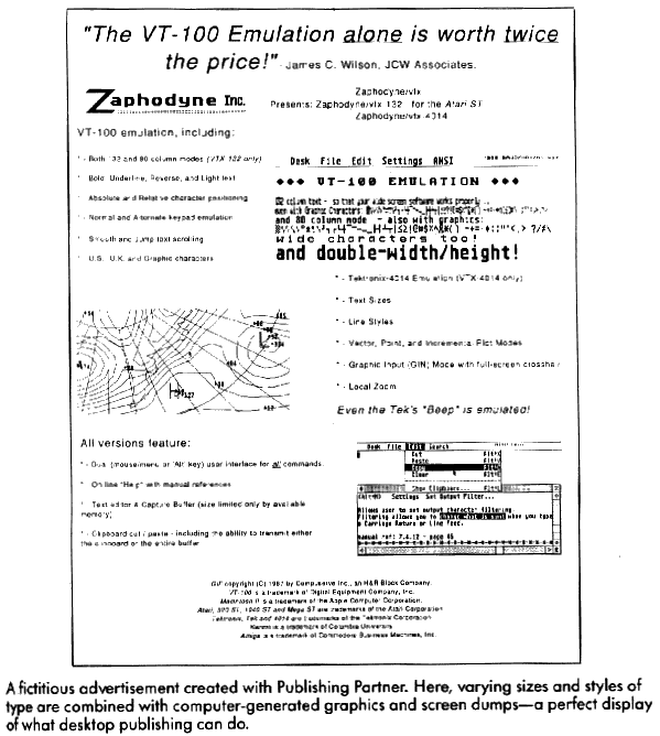 Thanks to a custom printing scheme, Publishing Partner can print its fonts at any point size on the relatively inexpensive laser printers from Atari and Hewlett-Packard. Soft Logik includes three fonts with its program, and sells 14 more in its Font Packs. And if none of the existing fonts suit your fancy, you can buy Font Editor Partner from Interactive Microsystems and design your own-something you can't do with GDOS or PostScript fonts.