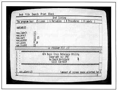 Buying GFA BASIC made me think of all the BASIC programming utilities I've used over the years-some good, some not so good. I think the two programs I found the most useful were a line renumbering utility and a variable-and-label cross-reference program. With GFA BASIC, the first program was obsolete, but I could certainly use the second. I quickly discovered that a cross-reference program did not exist for GFA BASIC, so I decided to write my own. Thus Xref was born.