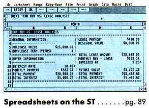 Should you buy a car or can you save money by leasing? This month's Business Applications column by Chnstoph Herd is accompanied by a buy/lease spreadsheet template to help you decide. Load this .WKS file into any ST spreadsheet that can read Lotus 1.0 files and plug in your own numbers. File BUYLEASE.ARC; requires a Lotus-compatible spreadsheet.
