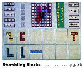 This month START presents a challenging puzzle game called Stumbling Blocks. Written by Mark Annetts, Stumbling Blocks will entertain you for hours as you try to fit the 12 shapes into a 60-square grid. Try the 8-by-8 puzzle for a strategic two-player game. Files STUMBLE.ARC and STUMBDAT.ARC; runs in low resolution.