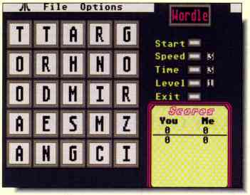 When time runs out, Wordle automatically strips out repeated words, short words (less than three letters), words that are not actually on the board and words found by both you and the' computer. Only those words unique to your list and over two letters long will be left. If Wordle does not have your word in its dictionary, it will ask you whether to add it or not. Your words, and the computer's are then scrolled in a window that appears on the right side of the screen, followed by your scores. You are awarded one point for a three letter word, two Points for a four letter word, three for a five letter word and so on.
