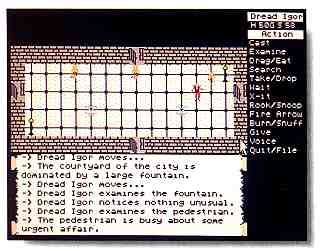 There are two actions that are not listed in the Actions menu: Move and Attack. You move using the mouse; simply click on the square you wish to move to. Attack is explained below. Note: you may terminate some actions before they are completed by pressing the [Spacebar]. For example, if you move across a room and a group of hostile creatures suddenly appears in the destination area, just press the [Spacebar] and try something else.