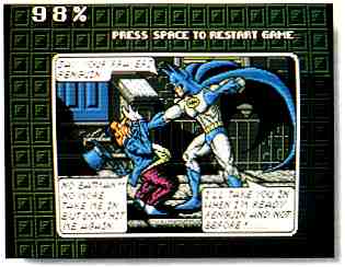 Batman's graphics are very impressive. From the Batcave to the urban scenes of Gotham City every frame is detailed down to the scum on the street (including the thugs). When I mention the word "frame" I mean the separate screens that appear as you move from one room to the next. As you leave one frame it fades and is overlapped by another. This method gives the look and feel of a comic book.