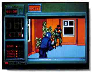 If you make it through a window you have to locate and gun down any terrorists. There's a nicely done mini-map of each floor that shows their positions and which way you're facing. If you're in danger, your name will flash and you'd better turn and eliminate the threat with your machine gun or, that's right, you're dead.