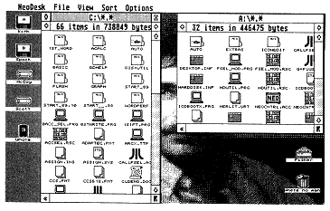 NeoDesk lets you drag a file icon from the window to the Desktop itself. From there, you can simply double-click on it to run it-so you no longer have to search through folders to find the file: there it is, on your Desktop. NeoDesk lets you open as many as seven windows (which open much faster than standard GEM windows). Clicking on the "<<" box in the lower left-hand corner of the active window sends that window to the back-or brings it to the front. It's also nice that you don't have to worry about a horizontal scroll bar in these windows-if a file icon doesn't fit horizontally, NeoDesk's "icon wrap" will move it down to the next line.