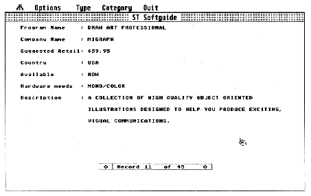 The display for each database listing is easy to understand. We've tried to make sure that all listings are accurate and up-to-date as of the time of preparation of the database. For this particular version, the listing is accurate as of July 1, 1989, just before START goes to press. Some notes, however: Suggested Retail is the latest suggested retail price, but it may have changed since we compiled the listing; Hardware Needed indicates the minimum system configuration needed and Description gives a brief description of the software.